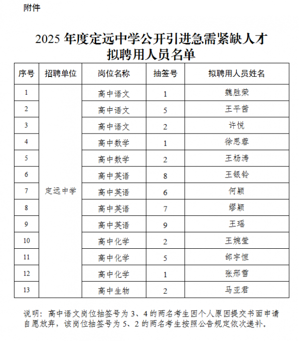 附件:2025年度定遠中學公開引進急需緊缺人才擬聘用人員名單